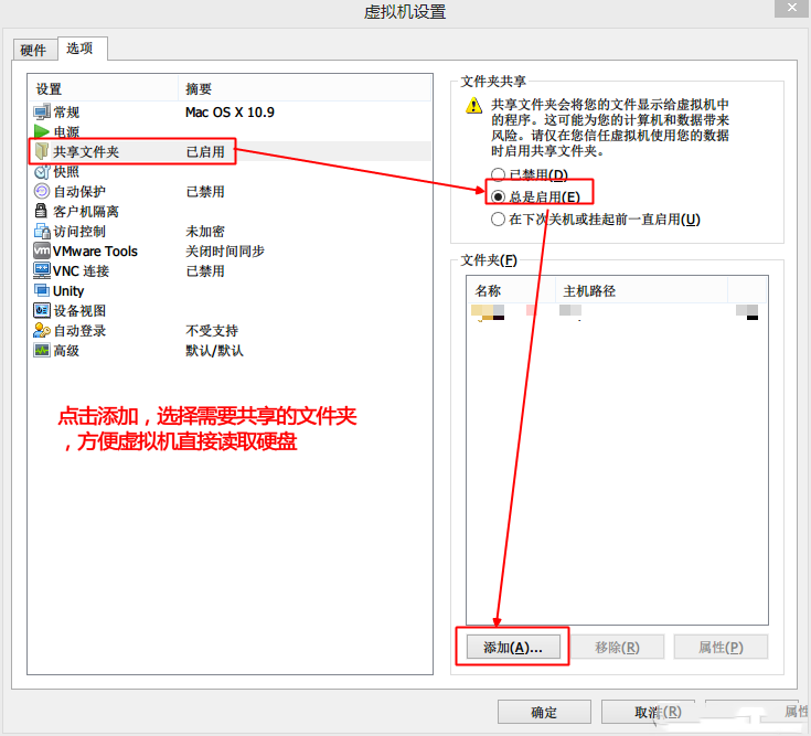 共享文件夹的说明:由于虚拟机无法访问本机的硬盘,所以需要设置共享文件夹来方便虚拟机读取电脑的物理内存。