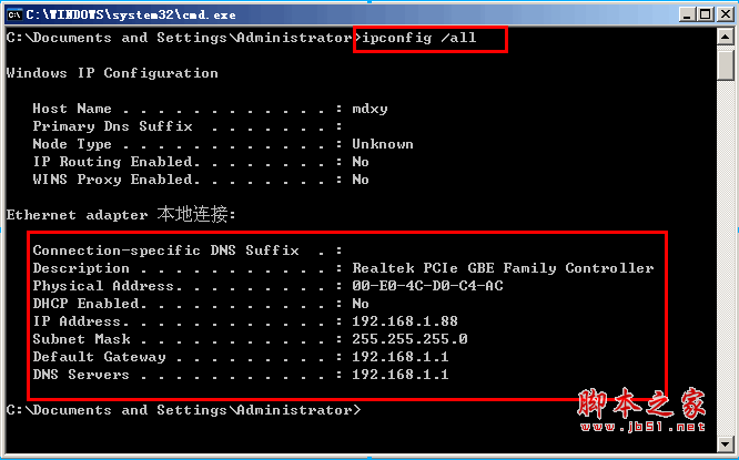 说白了cmd.exe就是cmd命令的简称。我们知道应用程序的后缀名一般都是**.exe。所以当看到cmd或cmd.exe的时候,只要知道是cmd命令窗口程序即可。cmd命令有很多,和dos命令其实都是一样的,可以看作是dos命令的精简版本,比如我们需要查看电脑网络连接,网卡、IP地址等信息即可在cmd命令窗口中输入ipconfig /all 命令,然后回车确认即可查看详细的网卡、本地连接等综合方面信息,如下图: