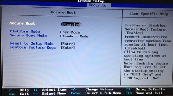 3. 在计算机重新启动至“Lenovo“LOGO画面时,并按下笔记本键盘上“F1”键进入笔记本的BIOS设置界面,按下键盘上“→”键将菜单移动至“Securfty“项目,选择Secure Boot进来界面把Secure Boot选项改成Disabled;