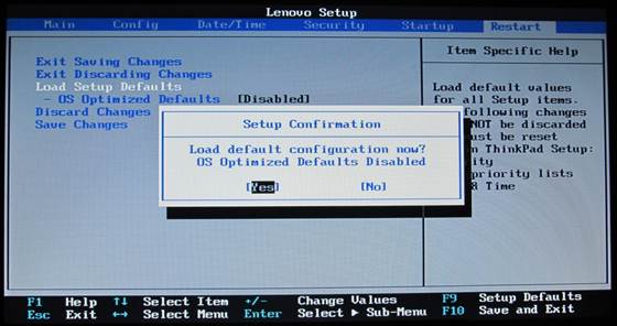 2. 进入BIOS设置界面后,按下键盘上“→”键将菜单移动至“Restart“项目,按下键盘上“↓”按键选择到” OS Optimized Defaults“选项,按下“回车”键打开该选项的设置菜单,按下键盘上“↑”按键将该选项默认的”Enabled“修改为”Disabled“之后,按下“回车”键确认。按下键盘上“↑”按键选择到”Load Setup Defaults“选项,按下回车键启动恢复BIOS默认功能窗口,在该窗口直接按下笔记本键盘上的”回车“键启动BIOS恢复默认功能。之后再按下笔记本键盘上“F10”键启动BIOS保存设置窗口,在该窗口中直接按下笔记本键盘上的”回车“键启动BIOS保存设置并重新启动计算机功能;