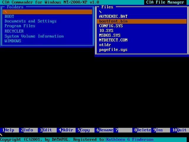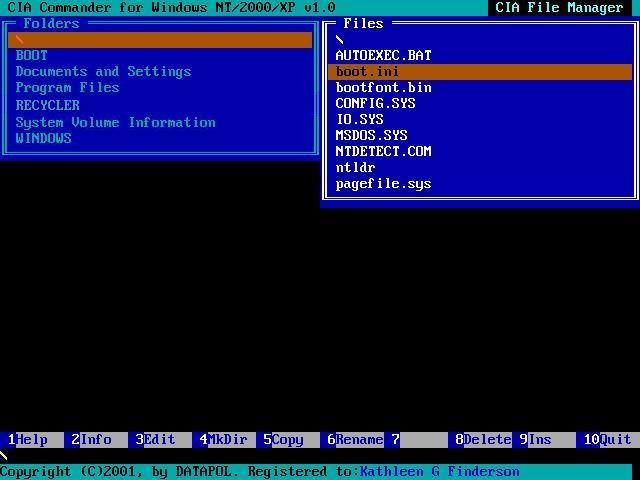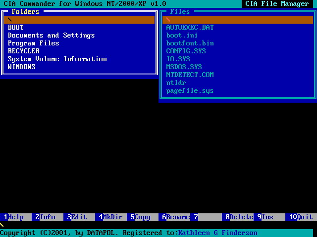 左侧为目录列表栏,右侧为选定目录中的文件列表,用“Tab”键切换。对文件或文件夹操作的快捷键∶F1(Help)帮助、F2(Info)显示文件信息、F3(Edit)编辑、F4(MkDir)新建目录、F5(Copy)复制、F6(Rename)重命名、F8(Delete)删除、F9(Ins)、F10(Quit)退出。