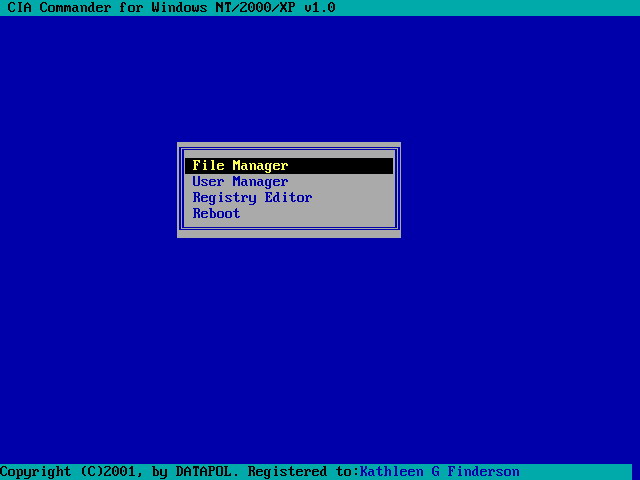 选择操作类型。File Manager文件管理、User Manager目录使用管理、Registry Editor、Registry Editor目录编辑、Reboot重启系统。