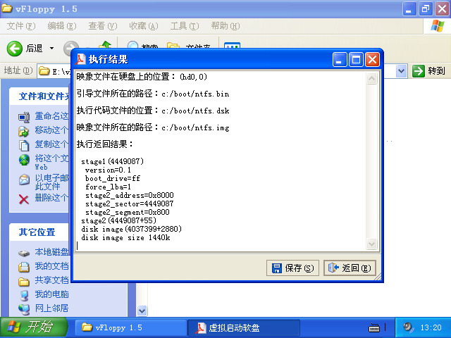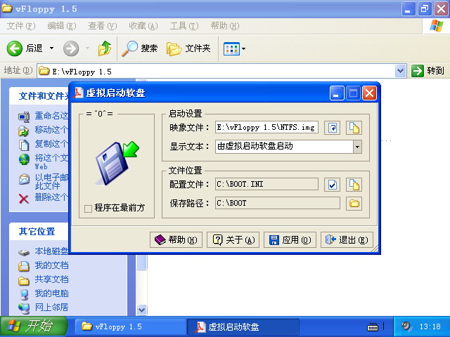 在上图中,保存路径用默认“C:\BOOT”就行,不管C盘是FAT32文件系统还是NTFS文件系统都不会影响启动;配置文件是指现在系统的启动配置文件boot.ini,一般情况下都在C盘根目录,所以使用默认“C:\BOOT.INI”就行;显示文本是指在启动菜单上显示进入DOS的选项的内容,可将“由虚拟启动软盘”改为你喜欢的内容(如 DOS),这里我不改了;映像文件就一定要选择了,在下载的vfloppy.rar中带有两个软盘映像文件,一个是BOOTDISK.img它是98启动盘映像文件,另一NTFS.img是DOS下可对NTFS文件系统进行图形化操作的软盘映像文件;另外亦可指定其它软盘映像文件。