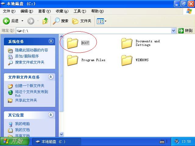按“Tab”键切换到右侧文件列表框,按向下方向键选择boot.ini文件,如下图13所示