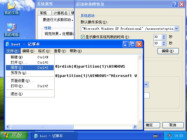 再修改启动菜单选项∶右键点击“我的电脑”,选择“属性”,在“系统属性”窗口中选择“高级”,在“启动和故障恢复”栏点击“设置”按钮,在弹出的“启动和故障恢复”窗口中的“系统启动”栏内点击“编辑”按钮,弹出“boot - 记事本”编辑窗口如下图18所示。(或者打开记事本程序,然后打开C:\boot.ini)