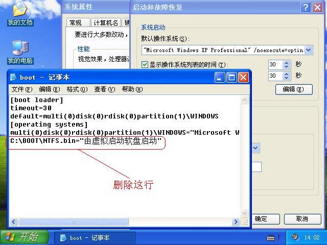 删除“C:\BOOT\NTFS.bin="由虚拟启动软盘启动" ”这一行(这一行或者显示为“C:\BOOT\DISKBOOT.bin="由虚拟启动软盘启动" ”。然后点击菜单中的“文件”--“保存”即可修复启动菜单。如下图19