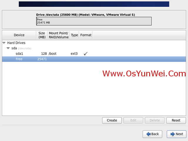 这里没有划分swap分区,对于大内存服务器,可以不用设置swap分区,或者在确定系统需要使用的内存大小后,