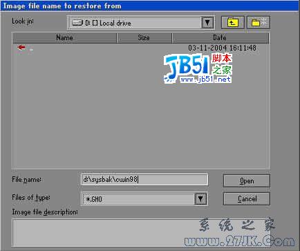 (三) 出现“镜像文件还原位置窗口”,如图12所示,在File name处输入镜像文件的完整路径及文件名(你也可以用光标方向键配合Tab键分别选择镜像文件所在路径、输入文件名,但比较麻烦),如d:\sysbak\cwin98.gho,再回车。