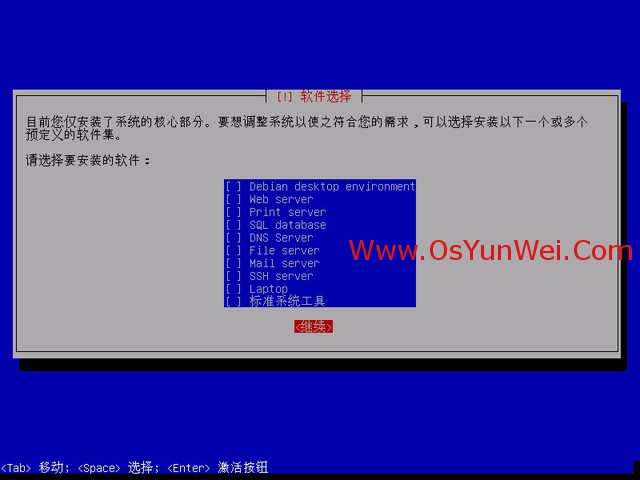 不选择任何软件包(服务器根据自己的需要再定制安装软件),点继续。