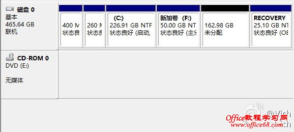 首先来看预装window8系统的磁盘分区,一般是一个系统盘和一个系统恢复盘。我们需要把C盘减小,然后腾出空间做为其他分区。