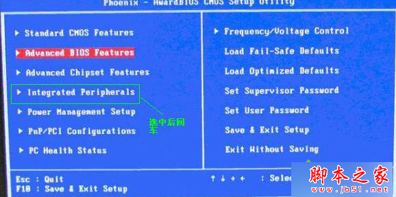 3、开机按DEL键进入BIOS,选integrated peripherals(绿色框),回车,进入后可以看到里面有一项onboard lan device,按功能键区的page up 或 page down, 选择disabled即可。