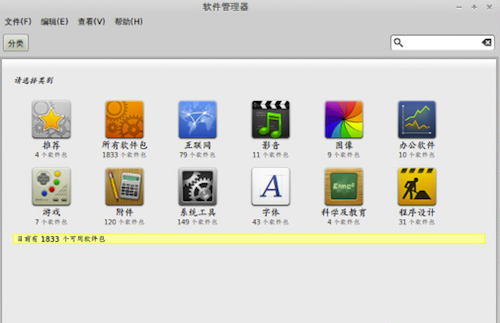 第七步:下图为软件管理器窗口,对软件进行了分类,方便查找与安装。