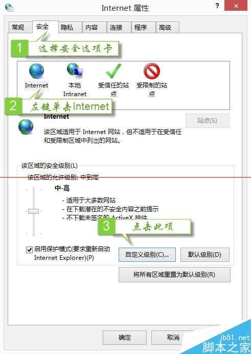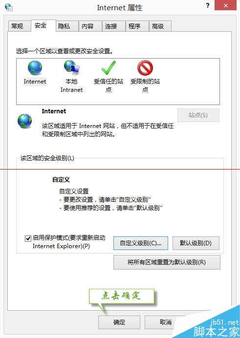 答:在“安全”选项卡上,上面的internet、本地int、可信站点、受限站点,都是需要单独设置“自定义级别”的。你如果把该站点加入了可信站点,再对internet或本地int进行设置是无效的。 你应该是没注意这点。 >>详细