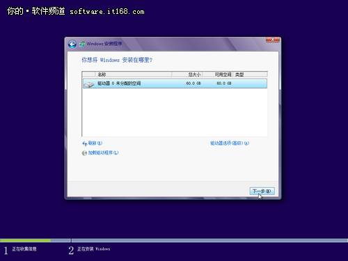 然后就是选择磁盘,由于我是在虚拟机上安装Win8系统,所以这里只显示了一个推荐分配空间,没有其他分区。也就是说,如果你有多个硬盘,或者是一个硬盘的多个分区,这里的显示选项会不一样。但一般的,如果你的电脑里没有其他系统,并且是第一次安装Win8系统,那应该安装到C盘,也就是引导分区;如果是安装多个分区,一般的,C盘已经安装了XP或者Win7,那么可以将Win8安装到D盘、E盘即可。