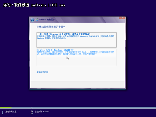 下面这张图,显示了安装的方式,升级安装或者是自定义(全新安装)。上面我们说了,如果你是现在购买了正版的Win7系统,Win8发布后,你若是再付费98元获得的序列号,那么这个安装界面,就选择升级。