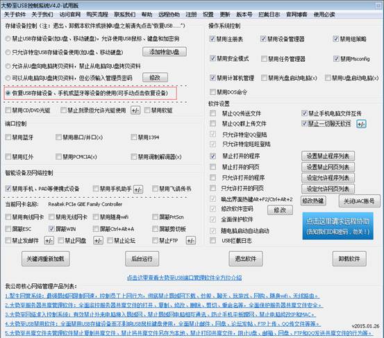 当然如果您觉得上述通过注册表解除U盘写保护的方法比较复杂,也可以通过专门的电脑U盘监控软件来实现,例如有一款“大势至U盘管理工具”(下载地址:http://www.grablan.com/monitorusb.html),不仅可以完全禁用U盘、禁止移动硬盘使用,有效防止通过USB存储设备泄露电脑文件;同时,还可以只允许特定U盘使用、只让从U盘向电脑复制文件而禁止从电脑向U盘复制文件。当然,也可以轻松恢复U盘使用、解除U盘写保护、去掉U盘写保护等。操作非常简单,点点鼠标即可,如下图所示: