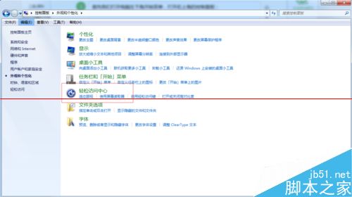 3、进入外观和个性化设置界面后,我们点击下方的轻松访问中心,然后点击下面的适应弱视,进入适应弱视设置界面。