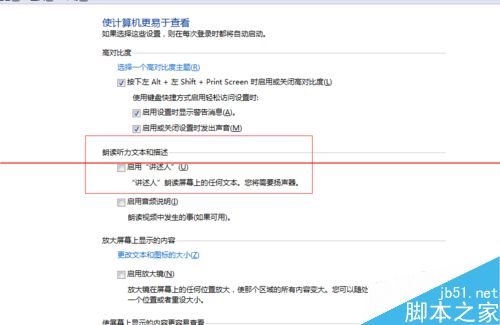 4、进入适应弱视设置界面后,我们把界面往下面拉。我们可以看到朗读听力文本和描述。可以看到有一个开启讲述人选项,我们在前面打勾即可。