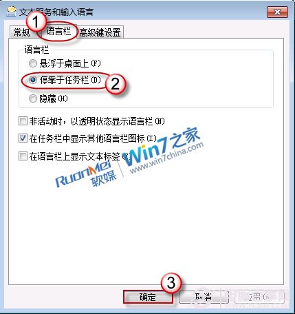 2、打开“语言栏”选项卡,点击选中“停靠于任务栏”后按“确定”退出。