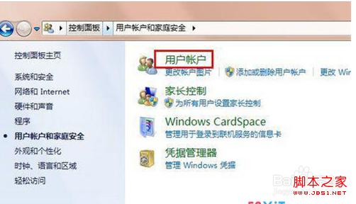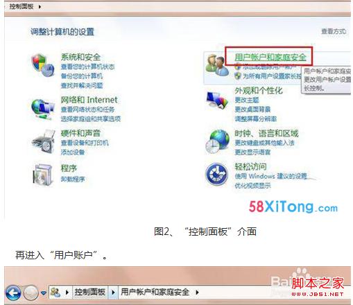 图1、进入“控制面板” 进入“用户账户和家庭安全”。