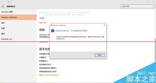 3、定位到“Windows Defender”,点击“使用Windows Defender”,你会收到提醒“此应用已经关闭,不会监视您的计算机”,这是为什么呢?接下里进行相关的设置。