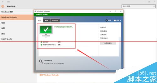 6、这次你会发现你的“Windows Defender”启动成功啦,你的电脑受保护啦。
