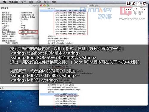 使用默认方式(文本编辑)打开,找到图中红框部分内容,这两部分就是认证机型列表了,按照相同格式,把自己电脑的Boot ROM版本信息添加进去即可。怎么查看Boot ROM信息?屏幕顶部菜单栏中找到关于本机,运行即可。笔者的MC374的Boot ROM版本为:MBP71.0039.B0E,需要添加的内容如图所示。