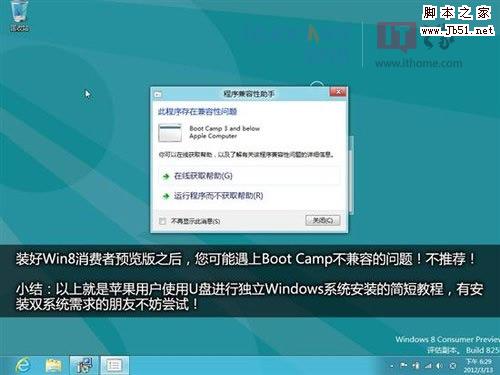 Win8系统装好后,笔者是遇到了Boot Camp驱动不兼容的问题,因此不推荐!至于该问题是否具有普遍性,还有待验证。全文小结:以上就是苹果电脑使用U盘安装Windows系统的详细流程。此方法优势在于您不需要准备Windows的原版系统光盘,也不需要使用随机系统盘进行驱动安装,不需要光驱,省事。不足之处在于U盘制作过程稍慢,系统安装速度甚至不及光盘!是否推荐:有光驱,有盘的情况下,这个可以省了;否则,您没得选择了吧?留一手永远是好的。