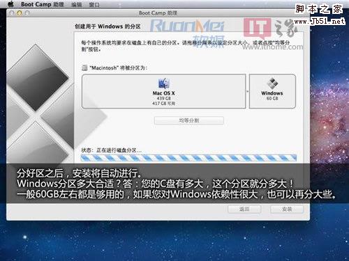 安装U盘制作成功,进入分区环节(需保证硬盘空余空间大于10GB)。反正Windows系统仅仅在某些特定场合才会使用,因此容量不必过大,30GB理论够用,60GB绝对够用!64G版本Air用户节哀,您还是别Boot Camp了,除非您选择放弃苹果系统。