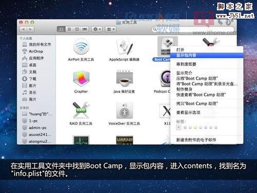 通过Finder,在应用程序 > 实用工具中找到Boot Camp助理,右键显示包内容,进入contents文件夹,找到名为“Info.plist”文件,只要把自己的笔记本型号信息添加进去即可。