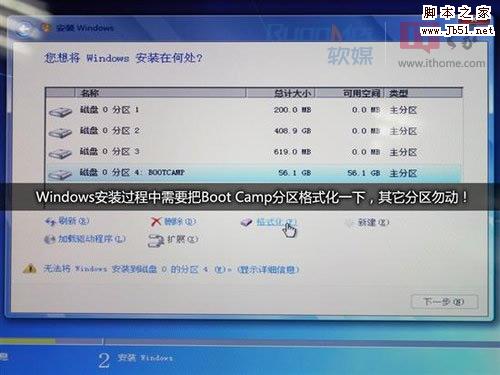 Windows系统的安装过程就不做介绍了,中途记得对Boot Camp分区进行格式化,然后把系统装到这一分区即可。(千万不要动其它分区!)