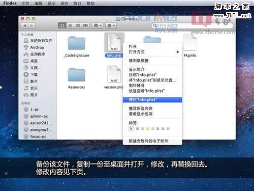这个就是“Info.plist”文件了,直接打开修改的话会提示创建副本之类的,因此建议采用替换法,拷贝一份至桌面,并对拷贝版本进行修改,再替换回去。