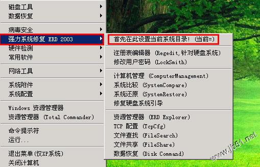 在设置从光驱启动之后,我们将光盘放入光驱中,然后开机重启,在重启之后,我们就会进入ERD commander 2003操作系统,然后我们点击开机,接着按照如图所示的界面中,设置当前系统目录,如图所示: