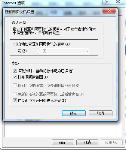 点开IE7的属性,切换到“内容”选项卡下,点击最下方“源和网页快讯”内的“设置”按钮,弹出“源和网页快讯设置”对话框。取消“自动检查源和网页快讯的更新”选项,即关闭了此自动同步RSS功能。