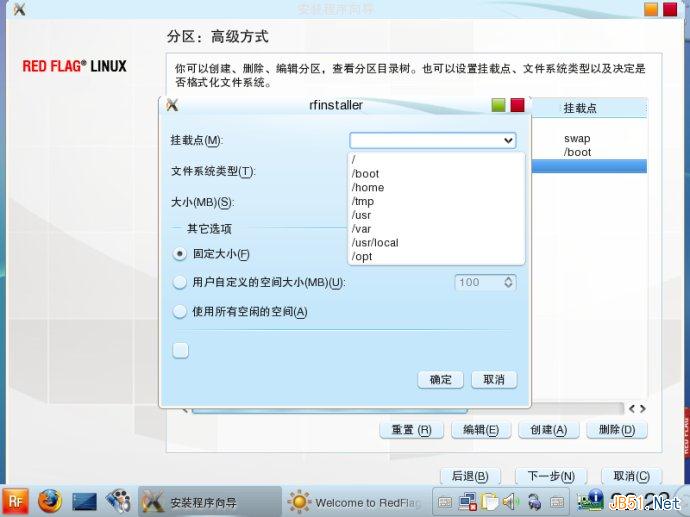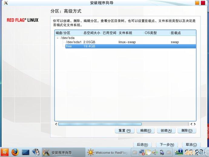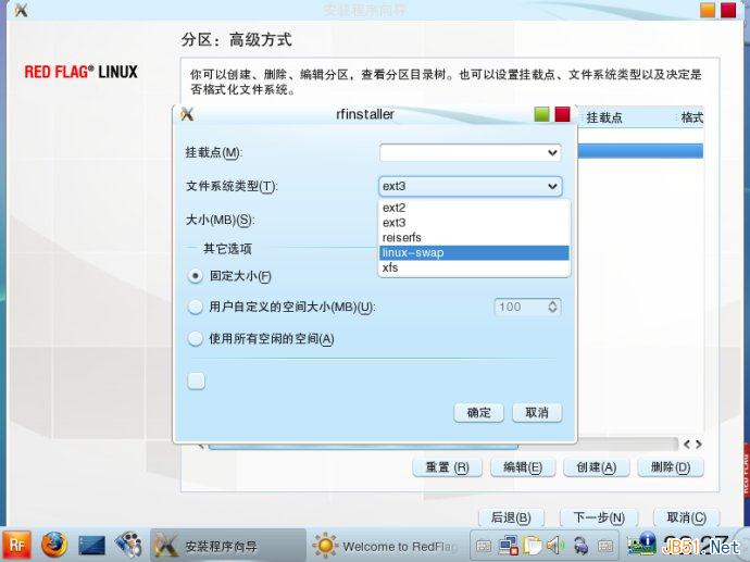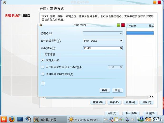 首先,建立一个“交换分区”,分区的大小试计算机的工作用途而定,一般情况下选择分区的大小为内存的两倍,最少不能小于内存大小。文件系统选择“Linux-swap”