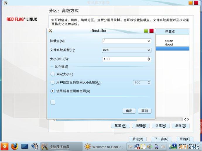 最后,再建立一个根分区,挂载点选择“/”文件系统选择ext3.此时将磁盘的所有剩余空间分给此分区,可点击“使用所有的空闲空间”。