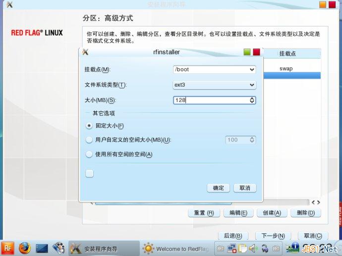 其次,建议再创建一个“/boot”分区,大小为128MB左右。挂在点选择“/boot”,文件系统选择ext3.
