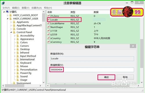 如果是中文繁体:我们把Locale的键值修改成"00000404",再点击:确定;