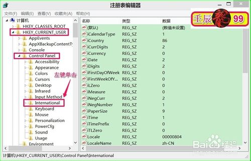 注册表路径:HKEY_CURRENT_USER]\Control Panel\ International,打开注册表编辑器,展开:HKEY_CURRENT_USER]\Control Panel,在Control Panel展开项中找到:International并左键单击:International;