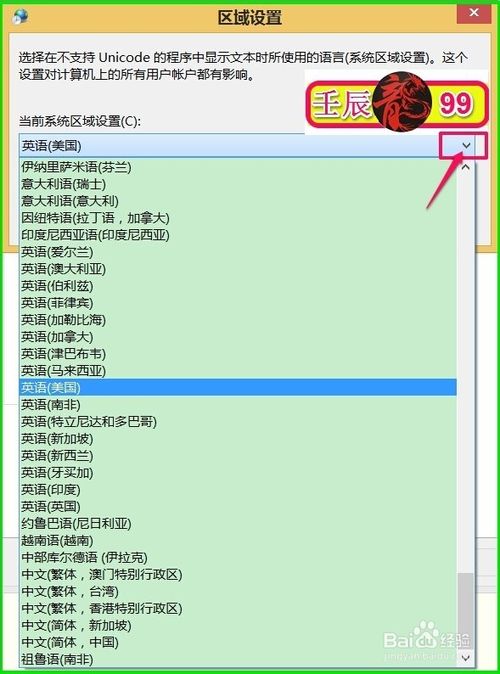 在区域设置窗口,点击当前系统区域设置(C)栏的小勾,选择:英语,再点击确定,重新启动计算机;
