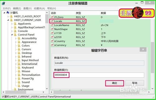 在International对应的右侧窗口找到Locale,左键双击Locale,弹出编辑字符串窗口,修改数值数据栏(V)中的数据,如果是中文简体,我们把Locale的键值修改成"00000804",再点击:确定;