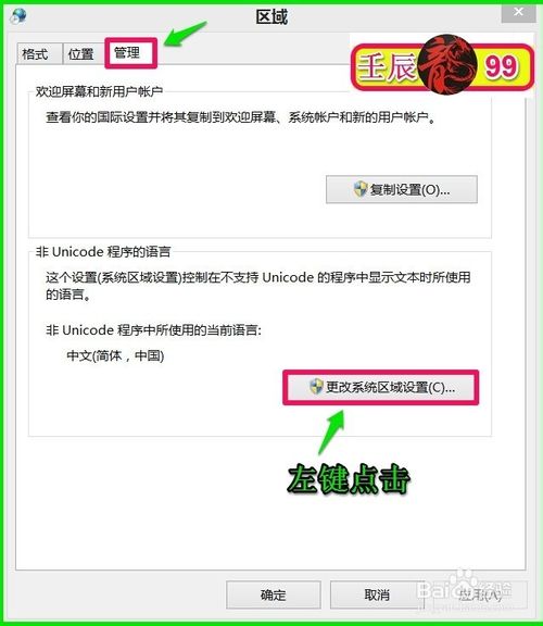 在区域对话窗口,我们点击:管理,在管理标签下的非Unicode 程序的语言项左键点击:更改系统区域设置(C)...;