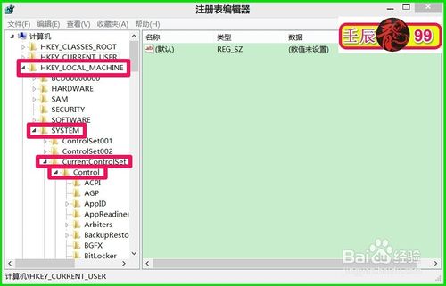 在打开的注册表编辑器窗口,展开:HKEY_LOCAL_MACHINE\SYSTEM\CurrentControlSet\Control