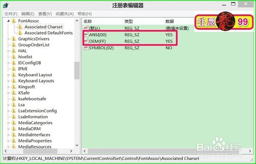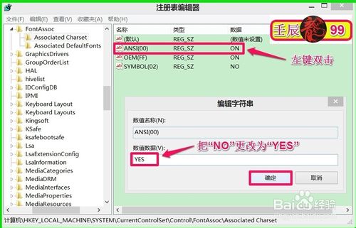在Associated Charset对应的右侧窗口找到:ANSI(00),左键双击:ANSI(00),弹出编辑字符串窗口,在数值数据(V)栏把“NO”更改为“YES”,再点击:确定;