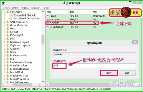在Associated Charset对应的右侧窗口找到:OEM(FF),左键双击:OEM(FF),弹出编辑字符串窗口,在数值数据(V)栏把“NO”更改为“YES”,再点击:确定;