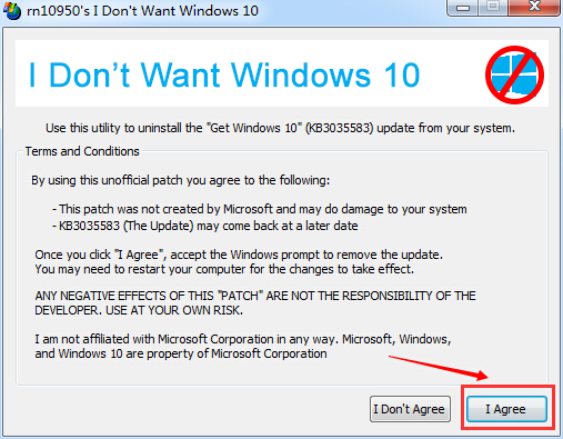 还有一个最简单的方法就是利用win10推送关闭软件I Don't Want Windows 10来关闭提示,这个小软件的作用就是自动帮你删除KB3035583补丁。删除之后重启一下,你就会发现烦人的Windows 10升级提醒不见了。