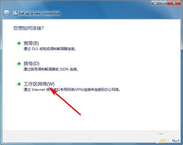 3、在弹出窗口中点击“工作区网络,通过Internet使用虚拟专用网络(VPN)连接来连接到办公网络”。