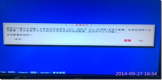 使用系统的自动网络配置选项。(这一步是系统自动配置网络,直接选择是就行了,系统安装完成之后可以通过手动的方式修改为静态ip地址。)