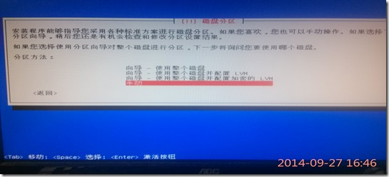 终于来到了有技术含量的地方了。Linux的磁盘分区。如果你是新手的话,建议你选择默认就可以了,这个是适合大多数人的。对于什么是LVM的问题可以直接进百度百科 ,上面写的比较通俗易懂。如果你是控制欲比较强的并且喜欢折腾的人的话,建议选择手动分区,这样你可以控制到每一个Kb的磁盘空间。如果你是全新安装的话,你可以直接进入到磁盘分割的界面,如果你之前已经分过磁盘了,但是不满意之前分过的,直接删除就Ok了,再选择磁盘进行重新分区。