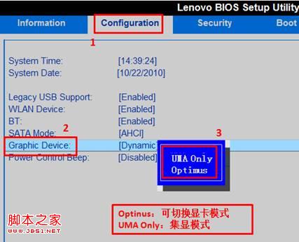 2. IdeaPad Y460A/Y560A/V360A/V460A/U460A:依次选择“Configuration”、“Graphic Device”,其中有两个选项:Switchable Graphics表示可切换显卡模式;Discrete Graphics表示独显模式